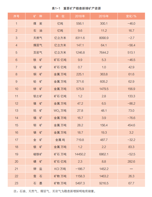 2019年,石油新增探明地質(zhì)儲(chǔ)量11.2億噸,其中,新增探明技術(shù)可采儲(chǔ)量1.6億噸。頁巖氣新增探明地質(zhì)儲(chǔ)量 7644.2 億立方米,其中,新增探明技術(shù)可采儲(chǔ)量 1838.4 億立方米。煤炭新增300.1億噸,較上年明顯下降。主要金屬礦產(chǎn)中錳礦、銅礦、鉛礦、鋅礦、鎢礦、鉬礦、銀礦等新增明顯,鐵礦、鎳礦、錫礦、金礦明顯下降。非金屬礦產(chǎn)中磷礦、石墨明顯增長。