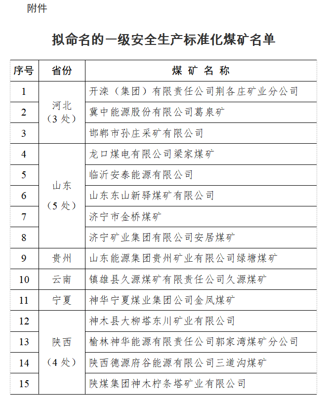 國家煤礦安監(jiān)局公示擬命名一級安全生產(chǎn)標(biāo)準(zhǔn)化煤礦共15處